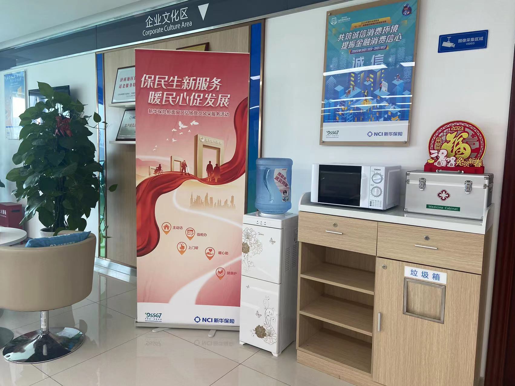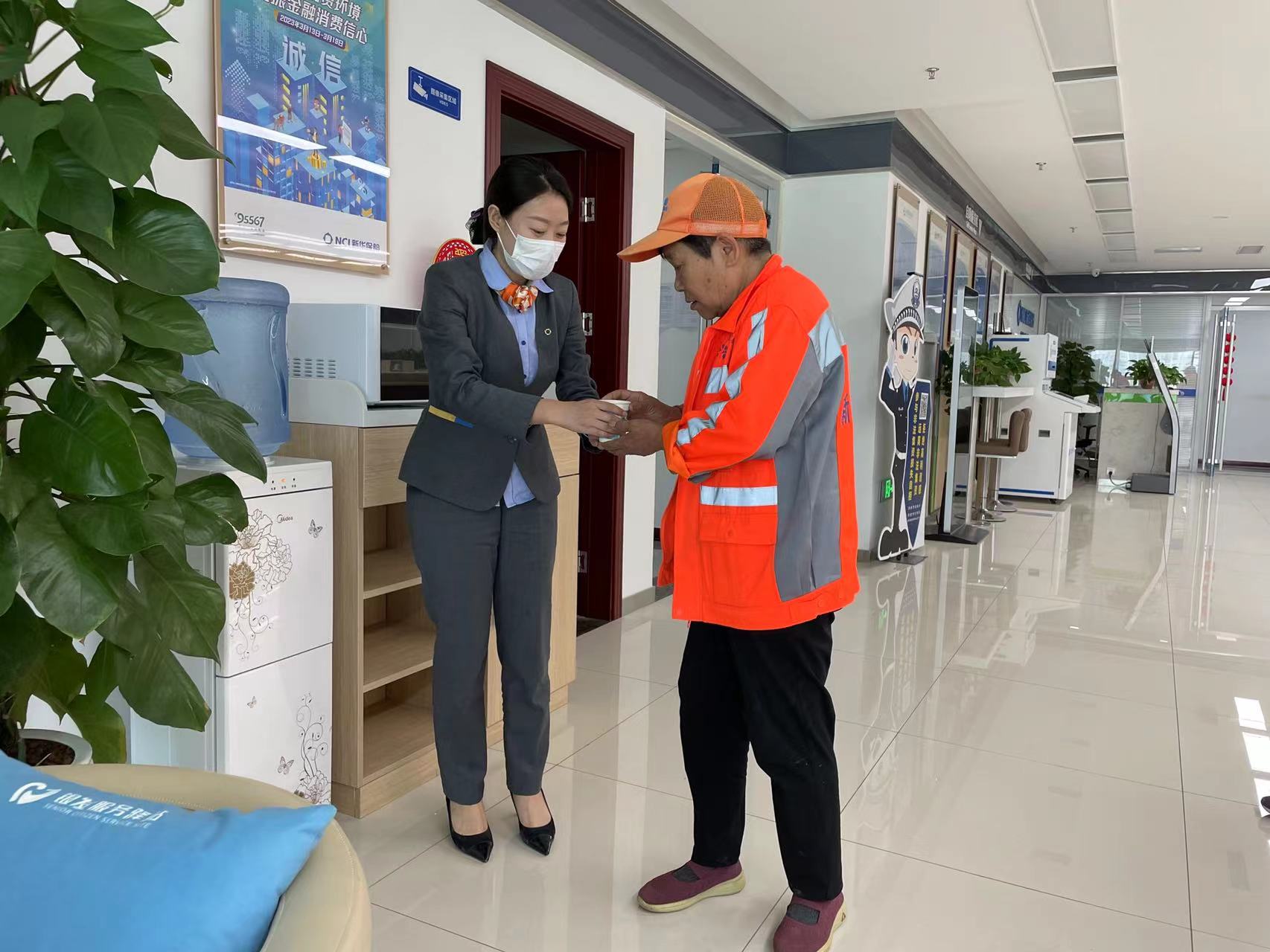 暖心助:济南中支柜面积极响应总公司暖心活动,在柜面配置饮水机、微波炉、充电器等便民服务设施,为快递人员、环卫工等户外劳动者及有需求的新市民群体提供休息、喝水、热饭、充电服务,为临柜残疾人员配置轮椅,提供暖心无障碍服务。
